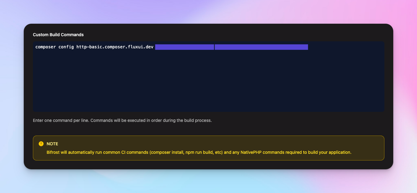 Custom build commands let you run arbitrary commands that may be useful during your build process, such as Composer auth for any private packages, like Flux UI.